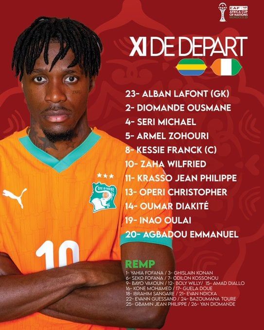 أعلن إيمريس فايي المدير الفني لمنتخب كوت ديفوار عن تشكيل مواجهة نظيره منتخب الجابون، المقرر لها في تمام التاسعة من مساء اليوم الأربعاء، على ملعب "مراكش"، ضمن منافسات الجولة الثالثة والأخيرة لدور المجموعات في بطولة كأس أمم أفريقيا 2025 المقامة حاليًا في المغرب.