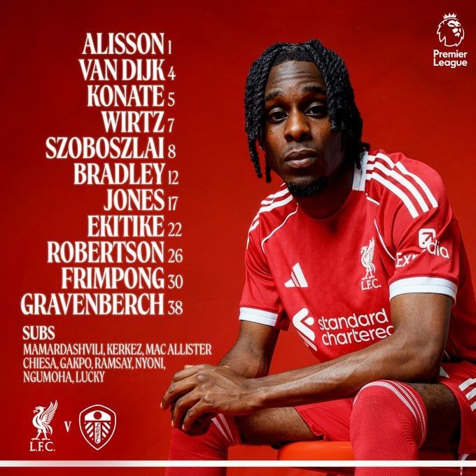 أعلن أرني سلوت المدير الفني لفريق ليفربول، عن تشكيل مواجهة ضيفه فريق ليدز يونايتد، المقرر لها في تمام السابعة والنصف من مساء اليوم الخميس، على ملعب "أنفيلد"، مساء الخميس، في افتتاحية العام الجديد، ضمن منافسات الجولة التاسعة عشرة من الدوري الإنجليزي لموسم 2025-2026.
