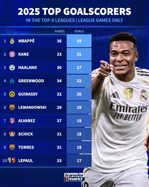 أما المركز الثالث في قائمة هدافي العام المنتهي 2025 بالدوريات الأوروبية الكبرى، فيذهب إلى إيرلينج هالاند، ماكينة أهداف مانشستر سيتي، حيث سجل النرويجي 27 هدفاً في 30 مباراة بالدوري الإنجليزي الممتاز وفي المركز الرابع يأتي ماسون جرينوود ، لاعب مرسيليا، برصيد 22 هدفاً في 34 مباراة بالدوري الفرنسي.