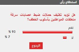 وأيد 93% من القراء مطالب تكثيف حملات ضبط عصابات سرقة متعلقات المواطنين بأسلوب الخطف، بينما عارض 7% من القراء مطالب تكثيف حملات ضبط عصابات سرقة متعلقات المواطنين بأسلوب الخطف.