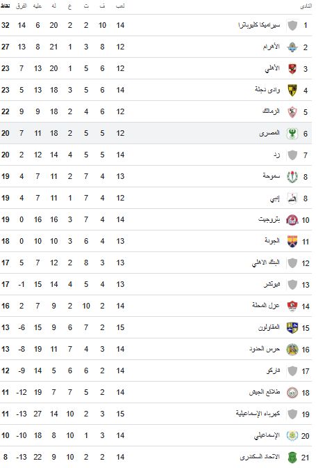 ويتصدر سيراميكا جدول ترتيب الدوري برصيد 32 نقطة، متفوقا علي بيراميدز والأهلي، فيما نجح المقاولون العرب في القفز ثلاث مراكز ليحجز المركز الـ 15 برصيد 13 نقطة، بينما تراجع الإسماعيلي للمركز الـ20 في جدول الدوري برصيد 10 نقاط، فيما صعد كهرباء الإسماعيلية إلى المركز الـ 18 بجدول ترتيب الدوري بعدما رفع رصيده إلى 11 نقطة، بينما يتجمد رصيد حرس الحدود عند النقطة 13 ويظل في المركز الـ 15.