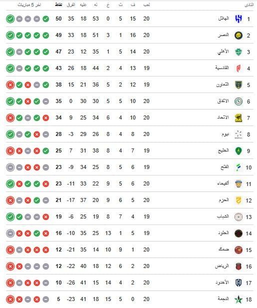 يتصدر فريق الهلال جدول ترتيب الدوري السعودي برصيد 50 نقطة يليه النصر برصيد 49 نقطة ، ثم الأهلي في المركز الثالث برصيد 47 نقطة ويأتي القادسية في المركز الرابع برصيد 43 نقطة.