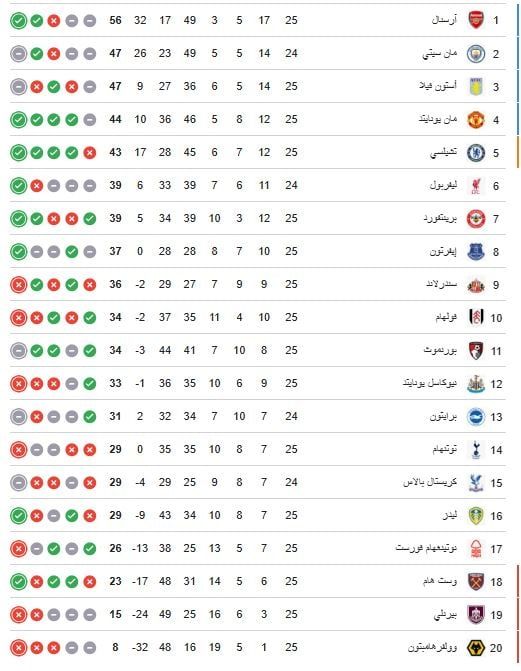1- آرسنال – 56 نقطة (25 مباراة)