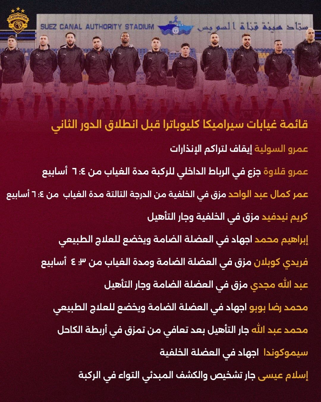 كما يواصل كل من عبد الله مجدي ومحمد عبد الله برنامجهما التأهيلي، بينما يعاني محمد رضا "بوبو" من إجهاد عضلي، ويخضع سيموكوندا للعلاج من إجهاد في العضلة الخلفية، في حين يخضع إسلام عيسى لفحوصات طبية بعد تعرضه لالتواء في الركبة.