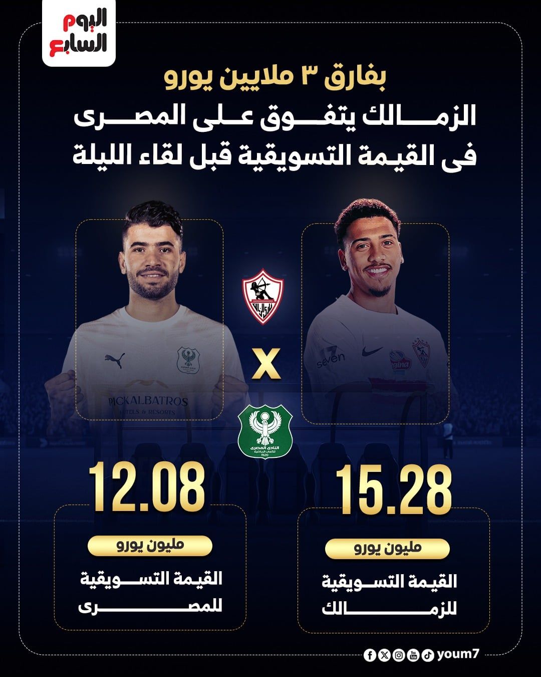 يتفوق نادي الزمالك على المصري البورسعيدي في القيمة التسويقية بفارق 3 ملايين يورو، حسب موقع ترانسفير ماركت، حيث بلغت القيمة التسويقية للفارس الأبيض 15.28، فيما جاءت القيمة التسويقية للنسر البورسعيدي 12.08 مليون يورو.