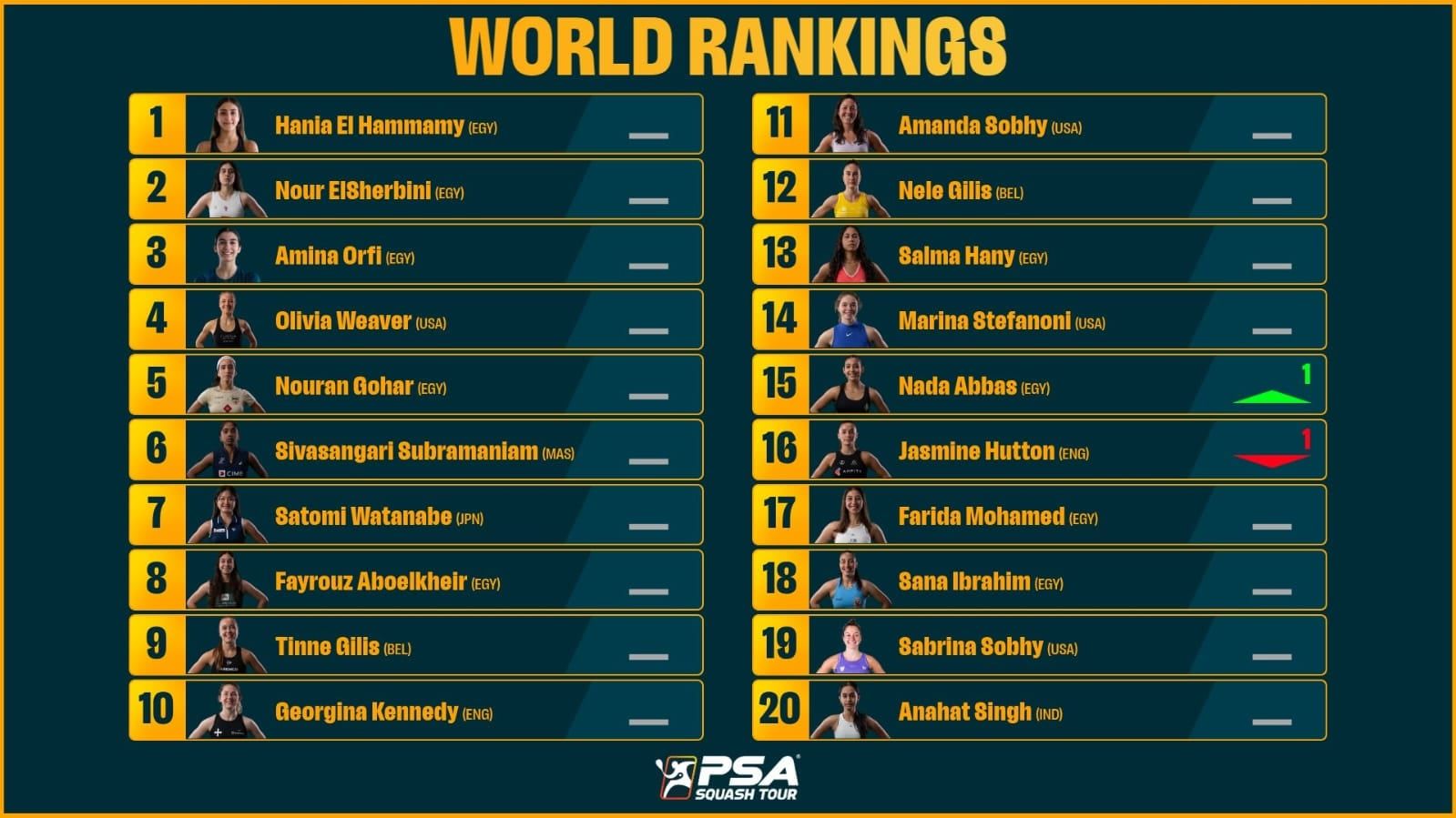 أعلنت رابطة اللاعبين المحترفين للاسكواش التصنيف العالمي الجديد للاعبين واللاعبات خلال شهر أبريل الجاري، وواصل الثنائي المصري مصطفى عسل وهانيا الحمامي تربعهما على عرش تصنيف الرجال والسيدات.