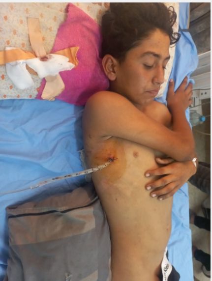 وتقول والدة الطفل الفلسطيني المصاب إن محمد أُصيب في العمود الفقري، في الفقرة السادسة والسابعة وجزء من الفقرة الثامنة الصدرية، ويوجد قطع في الحبل الشوكي أدى إلى شلل نصفي.