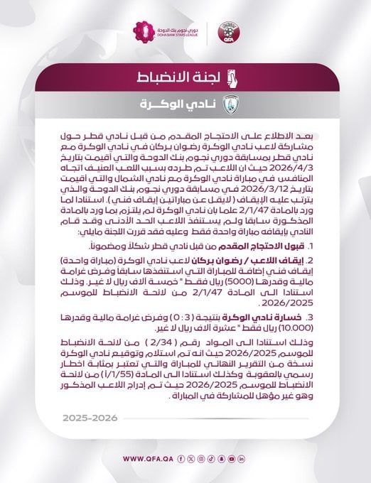 وجاء القرار بسبب مشاركة اللاعب الجزائري رضوان بركان مع الوكرة رغم تعرضه للطرد المباشر في مباراة سابقة أمام نادي الشمال بتاريخ 12 مارس، حيث كان من المفترض أن يلتزم بعقوبة الإيقاف لمباراتين بسبب اللعب العنيف، ما يجعل مشاركته في لقاء قطر مخالفة للوائح.