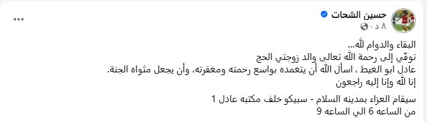 وتابع نجم الأهلى: "إنا لله وإنا إليه راجعون.. سيقام العزاء بمدينة السلام - سبيكو خلف مكتبه عادل 1 من الساعة 6 إلى الساعة 9".