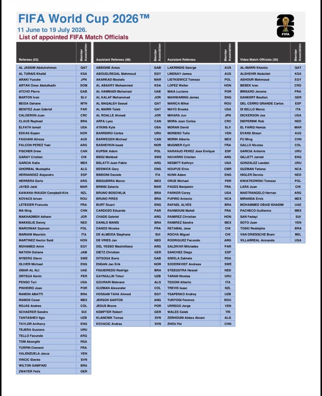 أعلن الاتحاد الدولي لكرة القدم " فيفا " رسميًا عن قائمة الحكام المختارين لإدارة مباريات كأس العالم 2026 في الولايات المتحدة وكندا والمكسيك، والتي تُعد الأكبر في تاريخ البطولة.