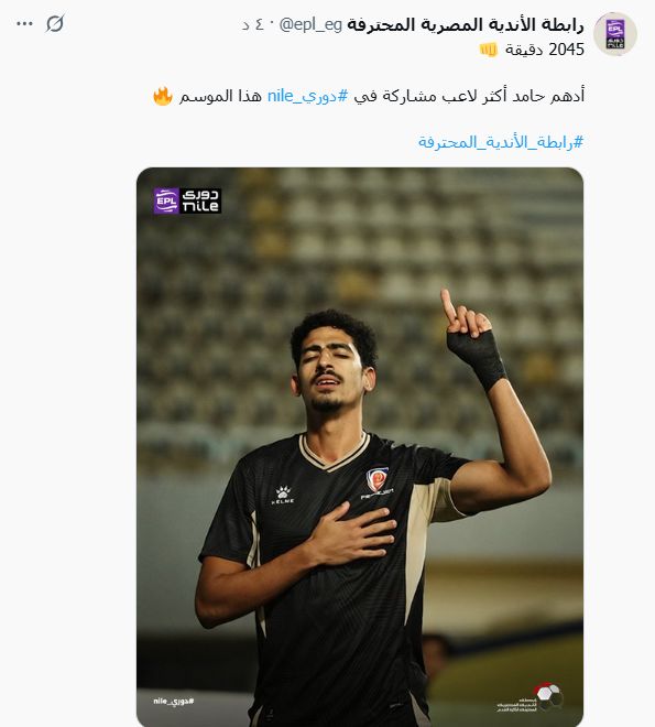 وكتب الحساب الرسمي لرابطة الأندية عبر حسابها على موقع إكس "2045 دقيقة.. أدهم حامد أكثر لاعب مشاركة في دوريnile هذا الموسم".