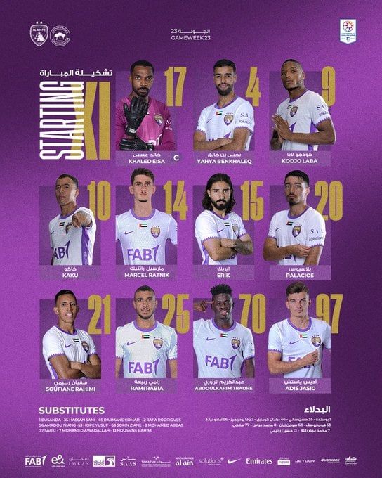 تواجد المصرى رامى ربيعة لاعب العين في التشكيل الأساسي لفريقه أمام البطائح.
