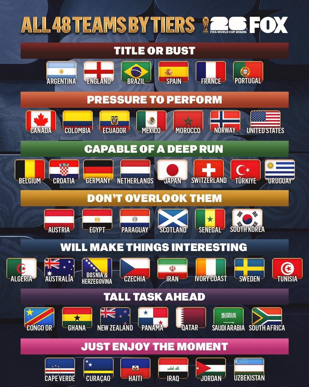 أجرت قناة فوكس سوكر الأمريكية تصنيفاً شاملاً للمنتخبات المتأهلة إلى نهائيات كأس العالم 2026، بهدف تقييم مستوياتها المتوقعة وقدرتها على المنافسة خلال البطولة المرتقبة، التي ستشهد مشاركة 48 منتخباً للمرة الأولى في التاريخ.
