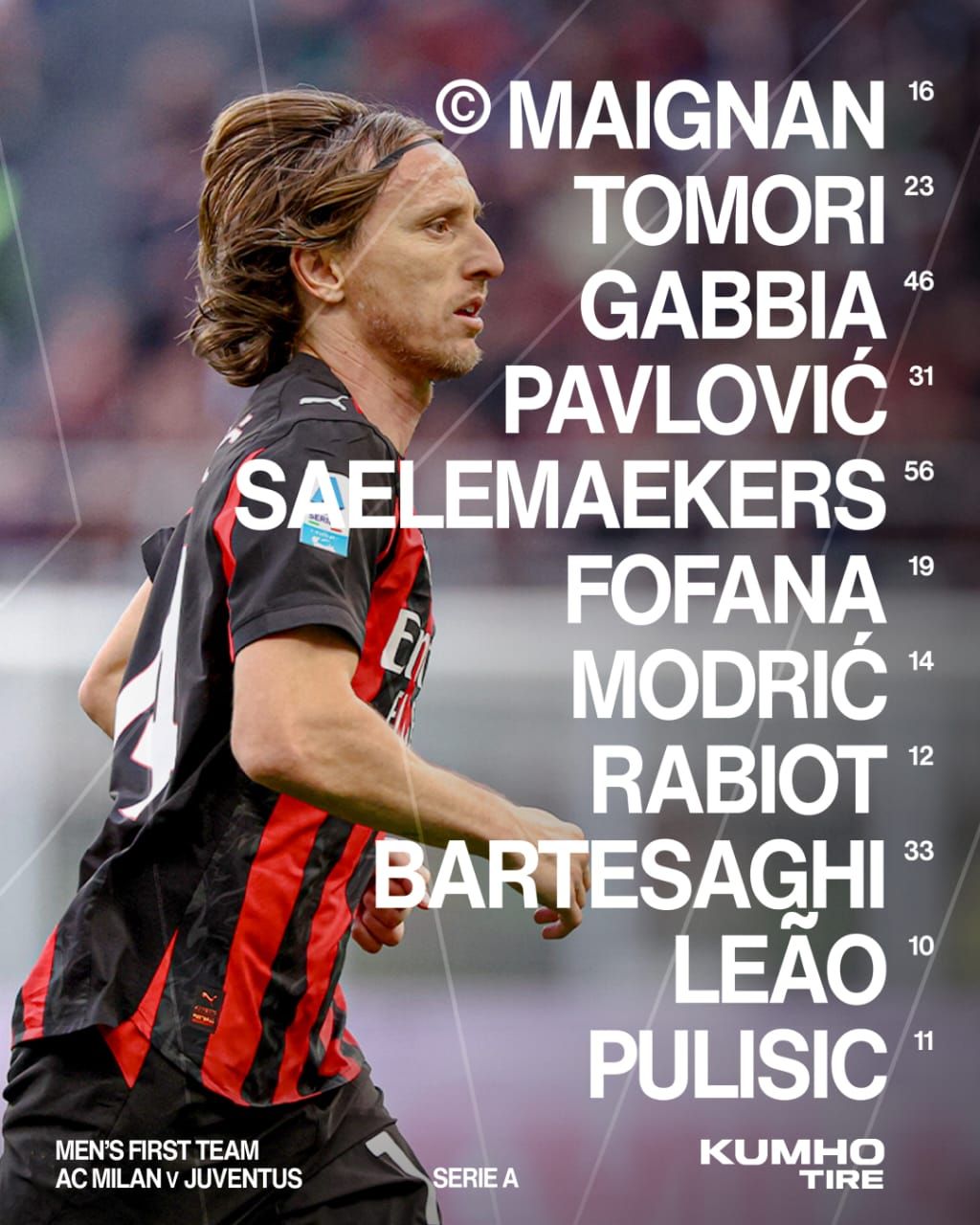 يدخل ميلان المباراة بتشكيل يجمع بين القوة الدفاعية والسرعة في الخط الأمامي، مع الاعتماد على الثنائي لياو وبوليسيتش لقيادة الهجوم في مواجهة دفاعات يوفنتوس.