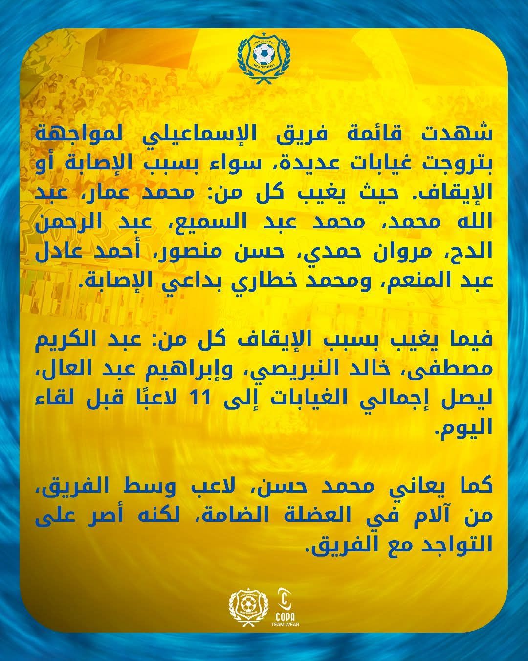 يغيب عن الإسماعيلى كل من محمد عمار، عبد الله محمد، محمد عبد السميع، عبد الرحمن الدح، مروان حمدي حسن منصور، أحمد عادل عبد المنعم، ومحمد خطاري بداعي الإصابة.