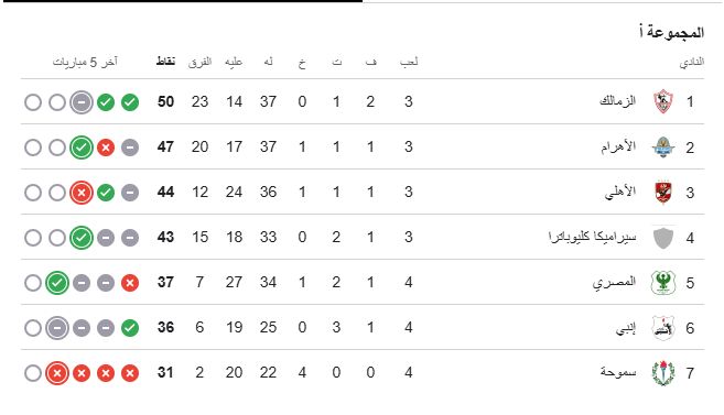 ويحتل نادي الزمالك صدارة جدول ترتيب مجموعة التتويج برصيد 50 نقطة، بينما يأتي بيراميدز في المركز الثاني برصيد 47 نقطة، وفي المركز الثالث النادي الأهلي برصيد 44 نقطة، وسيراميكا رابعاً برصيد 43 نقطة.