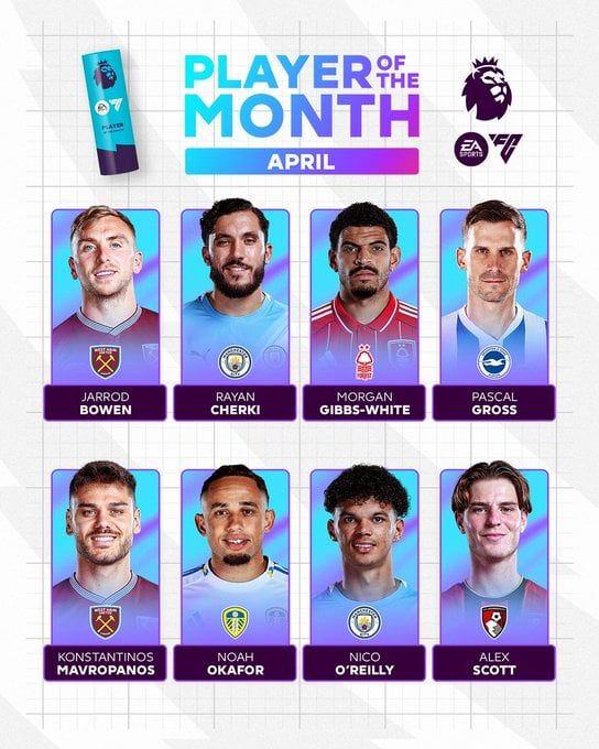 أما المرشحون الآخرون على جائزة أفضل لاعب في شهر أبريل، باسكال جروس (برايتون)، كونستانتينوس مافروبانوس (وست هام يونايتد)، نوح أوكافور (ليدز يونايتد)، نيكو أورايلي (مانشستر سيتي)، أليكس سكوت (بورنموث).