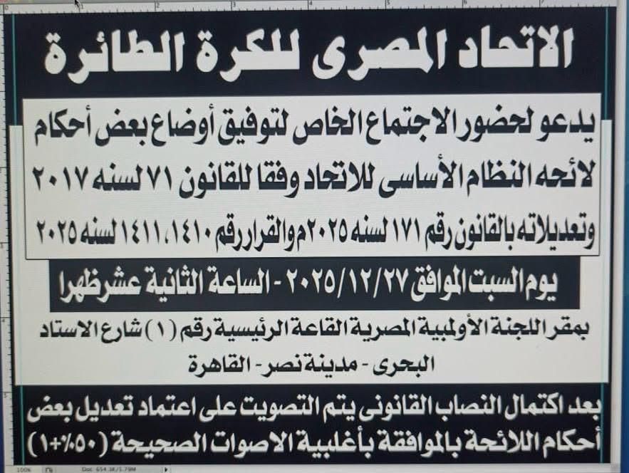 أعلن اتحاد الكرة الطائرة عن تحديد يوم 27 ديسمبر الجارى لانعقاد جمعية عمومية خاصة لمناقشة تعديلات لائحة النظام الأساسي بما يتماشي مع قانون الرياضة.