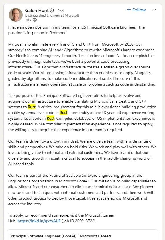 كشف عن هذه الخطة جالين هانت، وهو مهندس كبير في مايكروسوفت يتمتع بخبرة 28 عامًا في الشركة، بل إنه أعلن عن وظيفة شاغرة لمهندس برمجيات رئيسي (IC5) في ريدموند، وفي منشوره، أوضح هانت هدفه المتمثل في التخلص من جميع أكواد C وC++ في مايكروسوفت بحلول عام 2030، اللغة البديلة المختارة هي Rust، التي اكتسبت شعبية متزايدة في برمجة الأنظمة نظرًا لتركيزها على أمان الذاكرة والأداء دون الاعتماد على جمع البيانات المهملة.