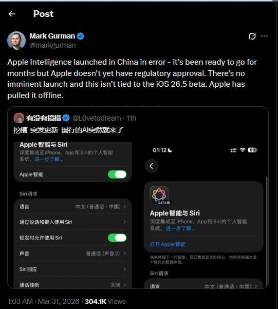 بحسب تقرير نشرته وكالة Bloomberg نقلًا عن الصحفي Mark Gurman، فإن Apple قامت عن طريق الخطأ بإتاحة ميزات Apple Intelligence داخل الصين قبل الحصول على الموافقات التنظيمية اللازمة.