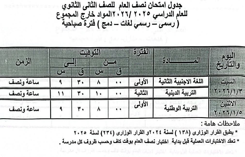 وبحسب الجدول المعتمد، تبدأ امتحانات الصف الثاني الثانوي بمادة اللغة العربية، تليها مواد التخصص لكل شعبة، وتشمل الفيزياء والكيمياء والرياضيات البحتة والتطبيقات الرياضية لطلاب الشعبة العلمية، والجغرافيا والتاريخ وعلم النفس لطلاب الشعبة الأدبية، بالإضافة إلى اللغة الأجنبية الأولى كمادة مشتركة.