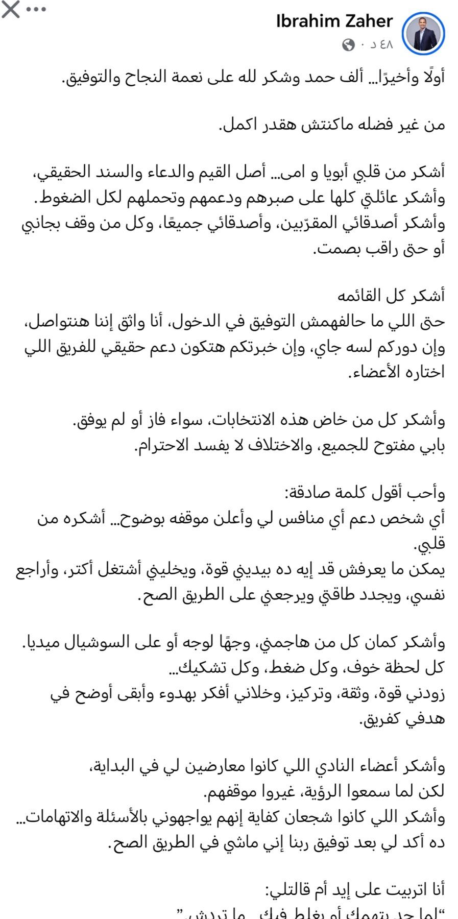 كما وجه زاهر رسالة شكر صادقة لكل من أعلن دعمه لمنافسين آخرين، معتبرا أن وضوح المواقف يمنحه دافعًا أكبر للعمل والاجتهاد ومراجعة النفس، ويُعيد تركيزه على الطريق الصحيح، مؤكدًا أن ذلك يشكل مصدر قوة حقيقية له.