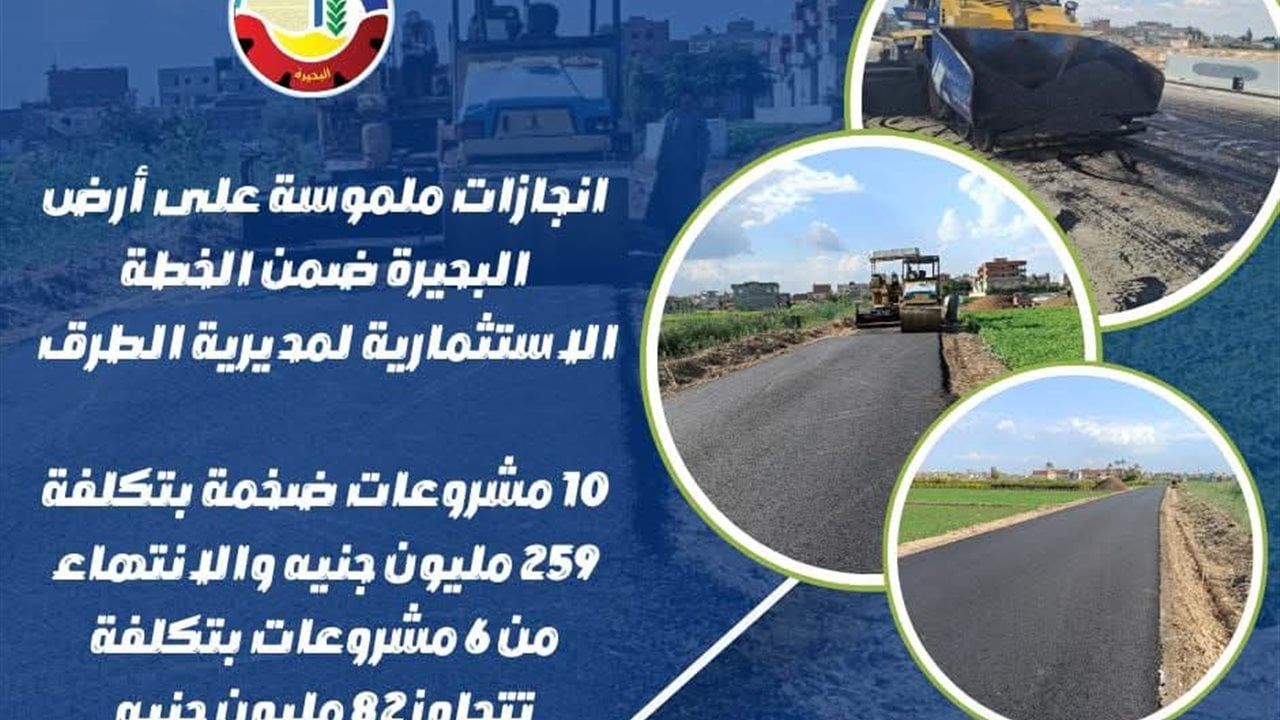 كما أكدت الدكتورة جاكلين عازر محافظ البحيرة أنه تم إستكمال طريق الكورنيش وأعمال الطبقة السطحية بدمنهور، بتكلفة ٢٠ مليون جنيه، وإستكمال ١٠٥ مالونا بناحية (الحلاوجة) بمركز أبو المطامير، بتكلفة ٥.٥ مليون جنيه، ورصف طريق جسر مصرف بمركز كوم حمادة، بتكلفة ٦.٥ مليون جنيه، وإستكمال طريق الشركات بمدينة إدكو، بتكلفة ٢٦ مليون جنيه، وإستكمال طريق الملح بمدينة إدكو، بتكلفة ١٨ مليون جنيه، وإستكمال طريق المصيف بمدينة إدكو، بتكلفة 6.5 مليون جنيه.