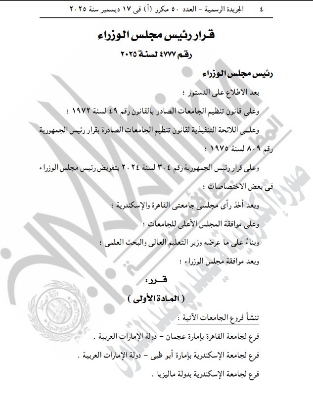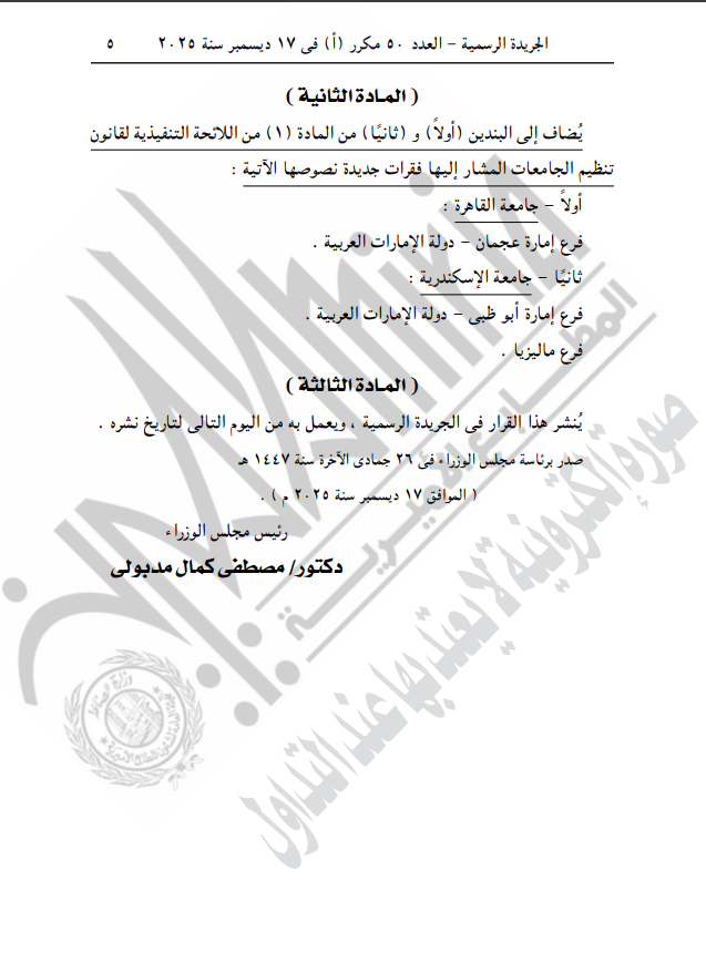 نشرت الجريدة الرسمية في عددها الصادر اليوم الثلاثاء، قرار الدكتور مصطفى مدبولي، رئيس مجلس الوزراء، بشأن إنشاء فروع لعدد من الجامعات المصرية في الخارج، بهدف تعزيز التعليم المصري وتقديم البرامج الأكاديمية بمعايير عالمية للطلاب في الإمارات وماليزيا.