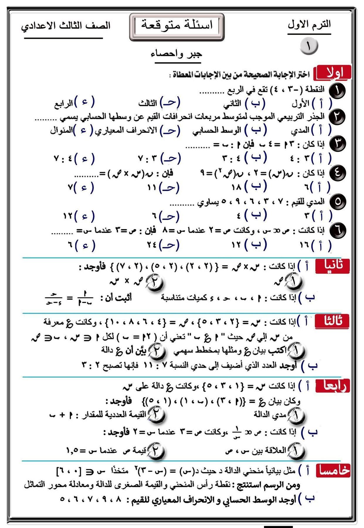 أسئلة متوقعة في الجبر والإحصاء للصف الثالث الإعدادي