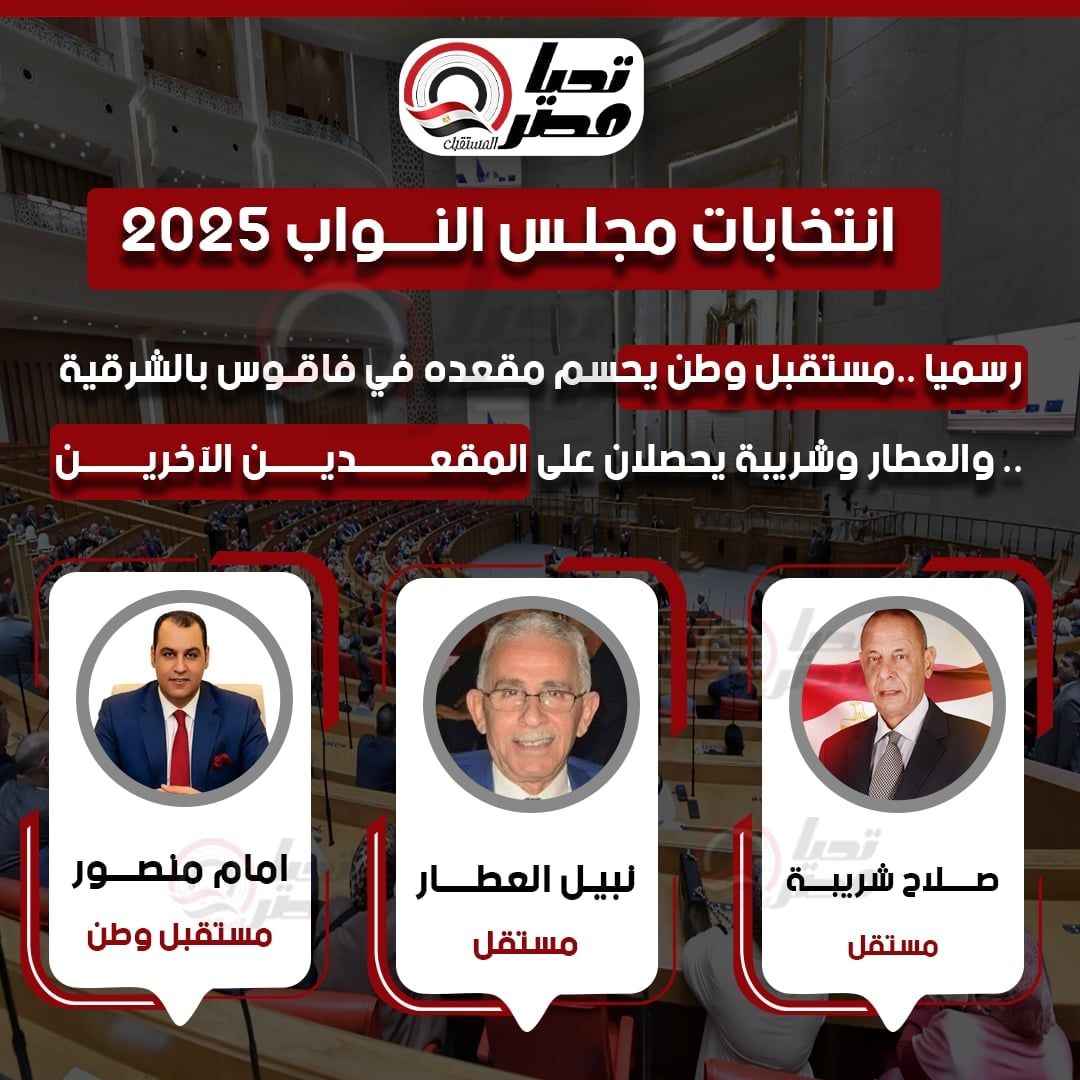 أعلنت الهيئة الوطنية للانتخابات عن فوز كل من صلاح شريبة مستقل، نبيل العطار مستقل، وأمام منصور عن حزب مستقبل وطن، في انتخابات مجلس النواب 2025 بدائرة فاقوس بمحافظة الشرقية، لتكتمل بذلك نتائج الجولة الثانية للمرحلة الثانية في هذه الدائرة.
