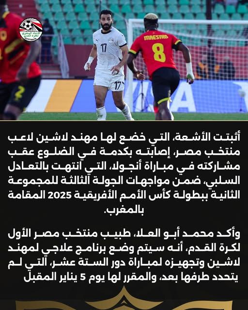 يستمر البحث عن تفاصيل إصابة مهند لاشين في مباراة منتخب مصر وأنجولا، وأعلن الجهاز الطبي لمنتخب مصر تفاصيل الإصابة التي تعرض لها مهند لاشين لاعب خط الوسط عقب مواجهة أنجولا، والتي انتهت بالتعادل السلبي ضمن منافسات الجولة الثالثة من دور المجموعات ببطولة كأس الأمم الأفريقية 2025 المقامة في المغرب، ويستعرض تحيا مصر التفاصيل.