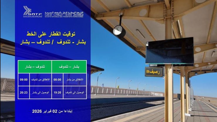 كما سينطلق القطار من تندوف نحو بشار على الساعة 09:00 صباحًا، مع تسجيل الوصول على الساعة 20:23.
