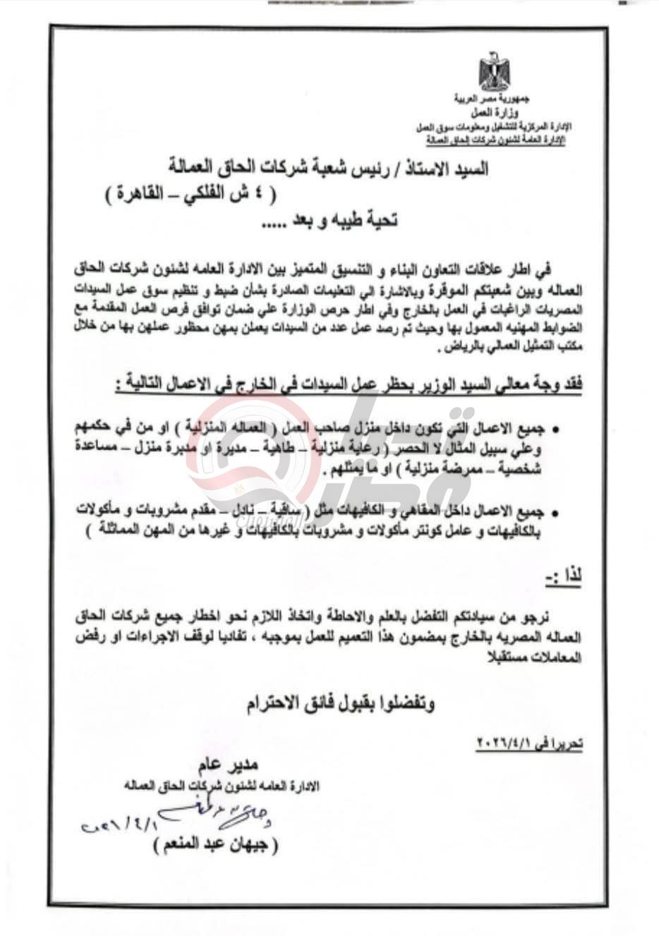 وجه حسن رداد وزير العمل شركات إلحاق العمالة المصرية في الخارج بحظر عمل السيدات في عدد من المجالات خارج البلاد، ومن أهم هذه الوظائف، العمل في الكافيهات والمهن داخل المنازل والرعاية المنزلية والطاهية ومديرة المنزل والمقاهي.