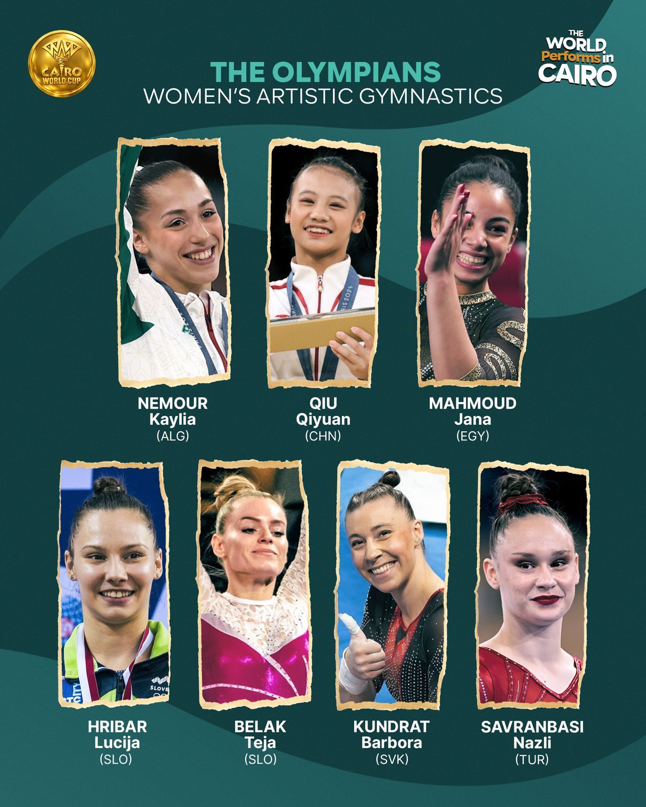 ويأتي على رأس المشاركين جني محمود البطلة الأولمبية من مصر، والجزائرية كيليا نمور صاحبة أول ميدالية ذهبية للعرب في أولمبياد باريس 2024، إلى جانب عمر العربي البطل الأولمبي المصري، والإسباني رايدرلي زاباتا الذي حقق الميدالية الفضية في أولمبياد طوكيو 2020.