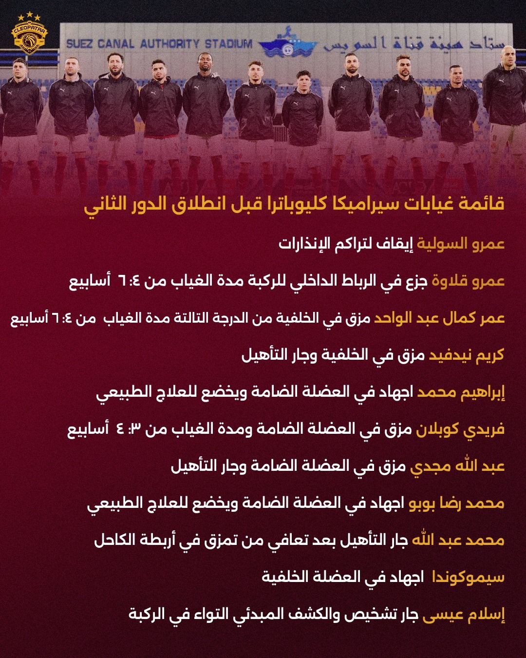 وحسبما نشر الحساب الرسمي لصفوف سيراميكا كليوباترا، قائمة الغيابات تشمل 11 لاعبا أي فريق بالكامل.