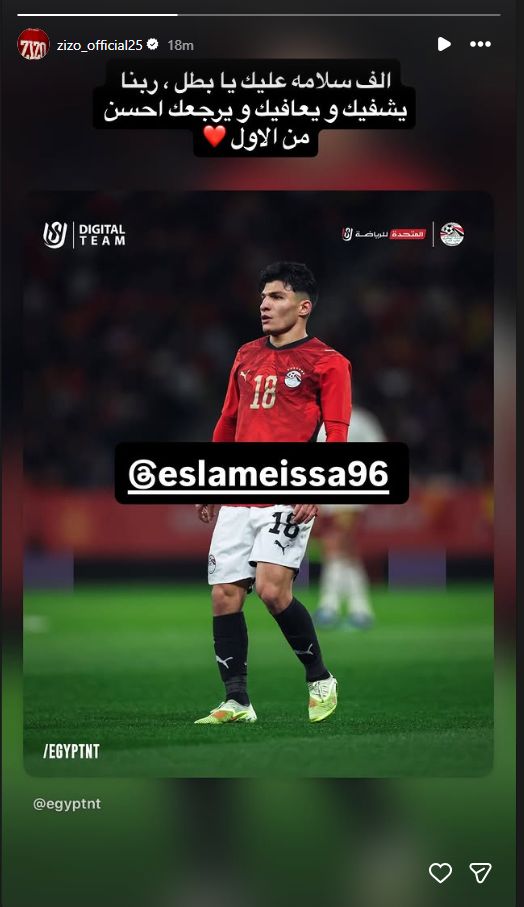 وفي لفتة إنسانية ، حرص أحمد سيد زيزو، نجم الأهلي ومنتخب مصر، على توجيه رسالة دعم إلى إسلام عيسي، حيث كتب عبر حساباته: "ألف سلامة عليك يا بطل، ربنا يشفيك ويعافيك ويرجعك أحسن من الأول".