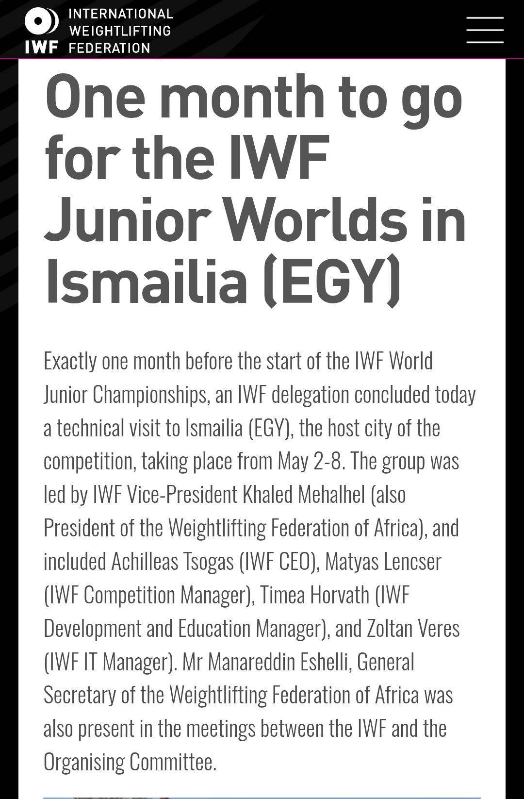 اختتم وفد الاتحاد الدولي زيارة ميدانية استمرت يومين إلى مدينة الإسماعيلية لمتابعة التجهيزات الخاصة بـ بطولة العالم للناشئين لرفع الأثقال، حيث ترأس الوفد خالد مهلهل نائب رئيس الاتحاد الدولي ورئيس الاتحاد الأفريقي.