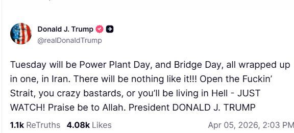 وكتب الرئيس ترامب منشور عبر منصة "تروث سوشيال" قائلاً:"يوم الثلاثاء سيكون يوم محطة الطاقة ويوم الجسر، في إيران. لن يكون هناك مثيل له!!! افتحوا المضيق اللعين أيها الأوغاد المجانين، وإلا ستعيشون في الجحيم".