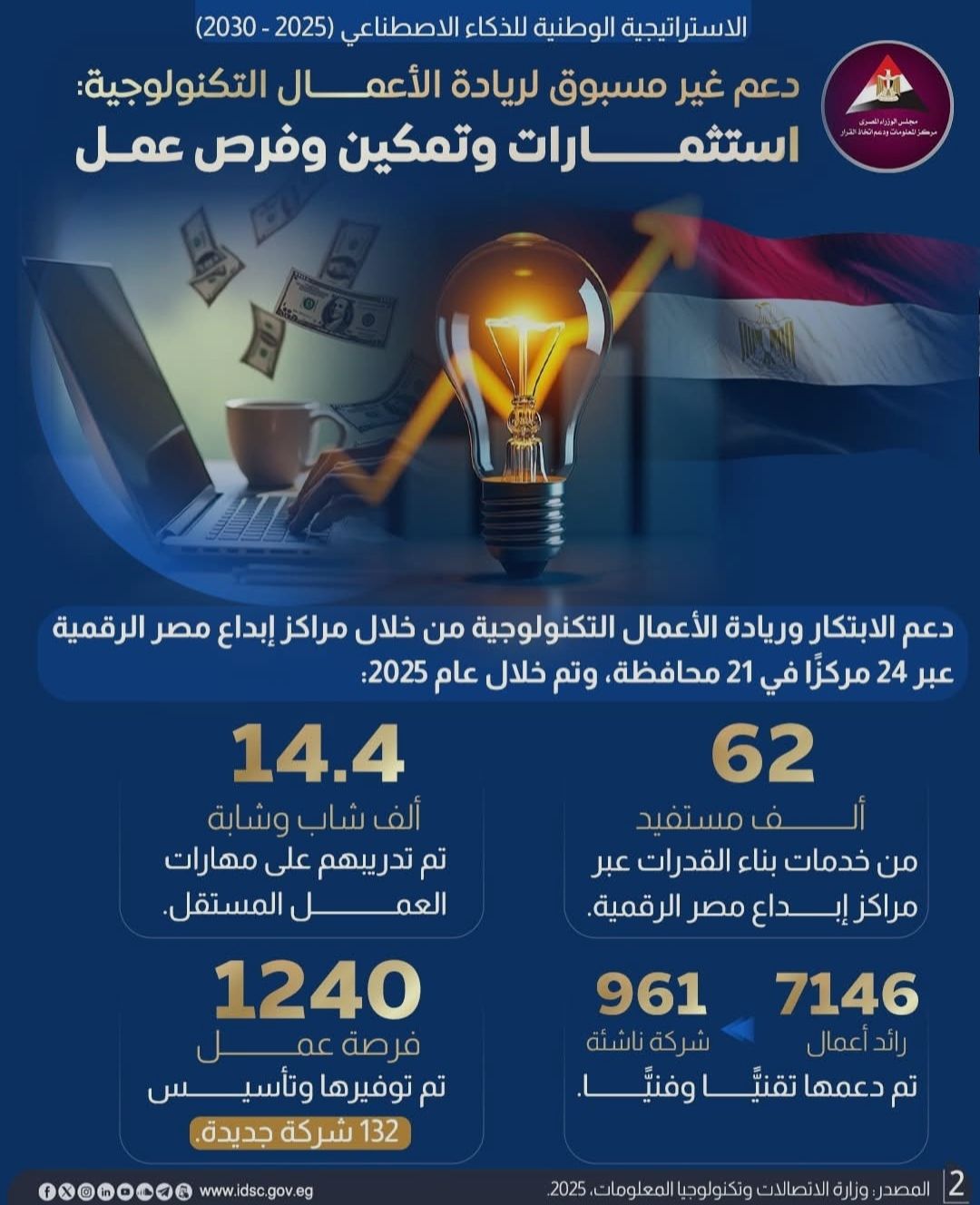 ويتكامل ذلك مع إطلاق الإصدار الثاني من الاستراتيجية الوطنية للذكاء الاصطناعي (2025-2030)، من قِبل المجلس الوطني للذكاء الاصطناعي في يناير 2025، والذي يستهدف تحويل مصر إلى بيئة حاضنة للابتكار وقاعدة إقليمية للاقتصاد الرقمي وريادة الأعمال التكنولوجية.