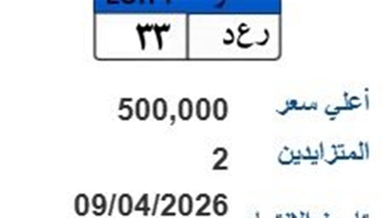 ومن بين اللوحات التي تُجرى المزايدة عليها، لوحة تحمل رقم (رع د- 33)، ووصل سعرها حتى الآن إلى 500 ألف جنيه، على أن تنتهي المزايدة عليها في 9 أبريل 2026 ويتزايد عليها 2 أشخاص.