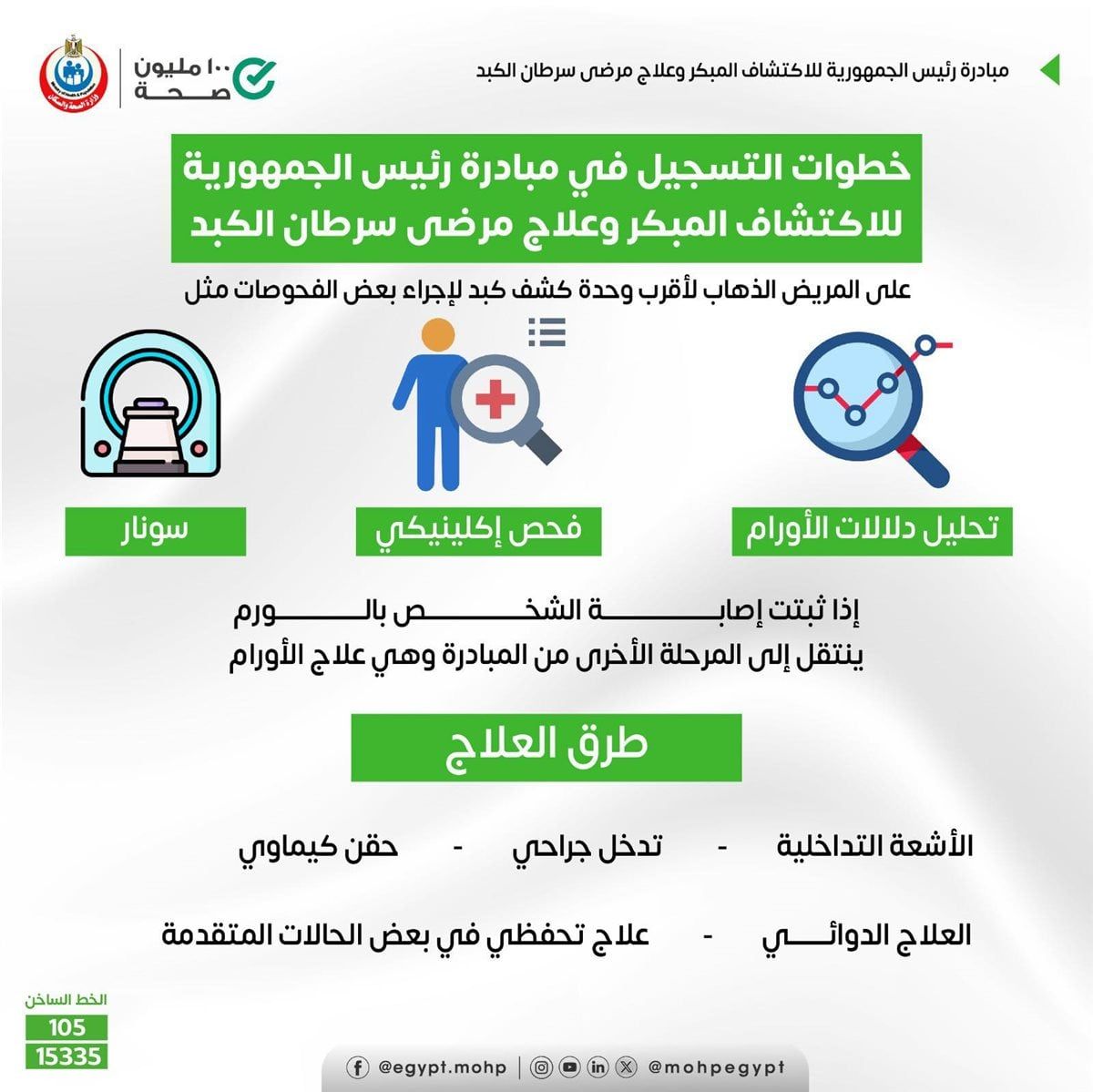 وأشارت الوزارة إلى أن المبادرة توفر مجموعة متكاملة من خيارات العلاج، تشمل التدخلات الطبية المختلفة، مثل الأشعة التداخلية، والتدخلات الجراحية، والعلاج الدوائي، إلى جانب العلاج الكيماوي، فضلًا عن تقديم العلاج التحفظي في بعض الحالات المتقدمة، وذلك تحت إشراف فرق طبية متخصصة.