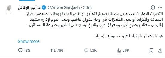 وكتب "قرقاش" في منشورعلى منصة X في أول تعليق إماراتي رسمي على اتفاق وقف إطلاق النار: "انتصرت الإمارات في حربٍ سعينا بصدق لتجنّبها، وانتصرنا بدفاعٍ وطني ملحمي، صان السيادة والكرامة وحمى المنجزات في وجه عدوان غاشم".
