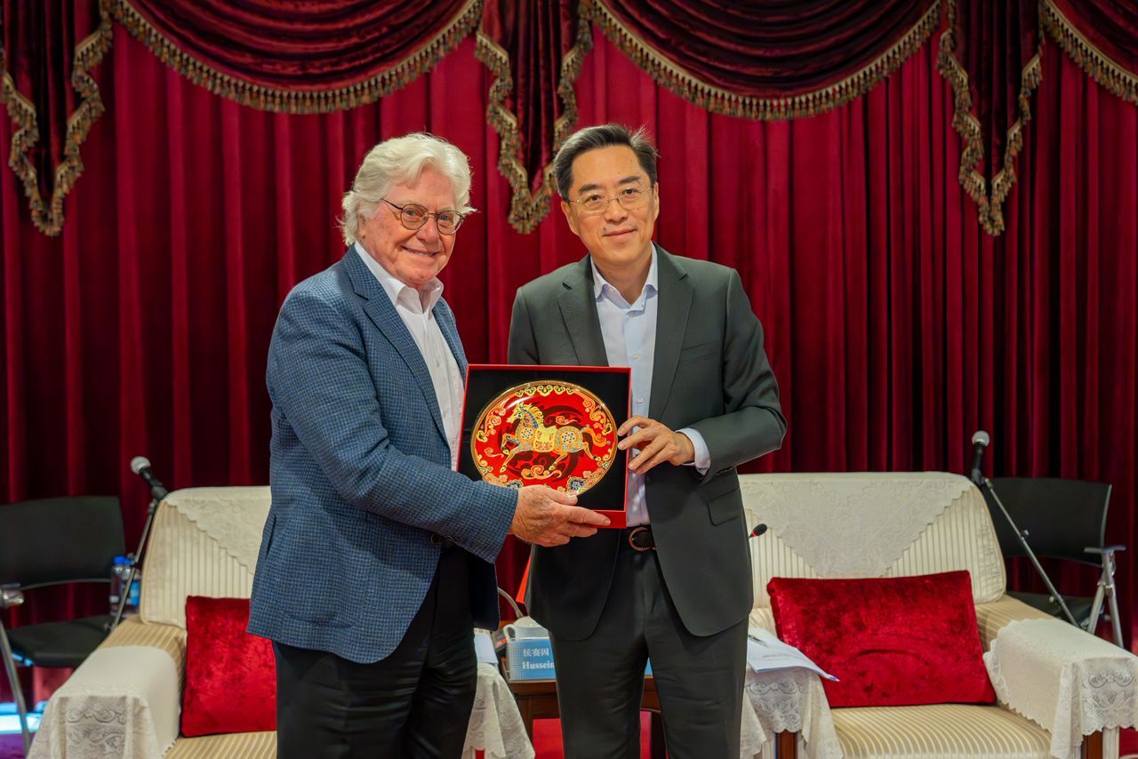 عقد الفنان حسين فهمي، رئيس مهرجان القاهرة السينمائي الدولي، جلسة عمل مع السيد فان يون، نائب رئيس التحرير في مجموعة الصين للإعلام (CMG) ورئيس تحرير شبكة تليفزيون الصين الدولية (CGTN).