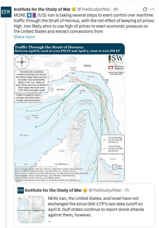 ووفقًا للمعهد، صرح مسؤولون إيرانيون، بأن إيران لن تسمح بمرور أكثر من 15 سفينة يوميًا عبر المضيق. وقبل الحرب، كان يصل عدد السفن التي تعبر المضيق إلى 140 سفينة يوميًا.