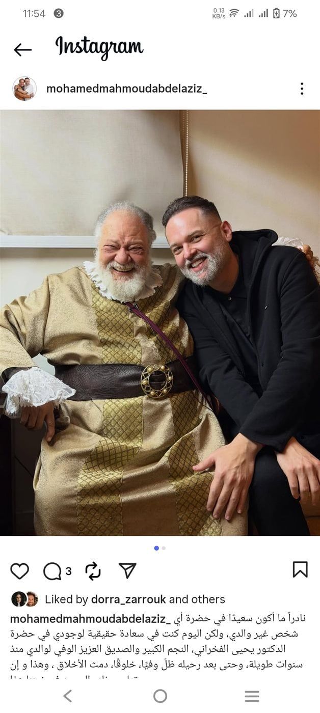 ونشر الفنان محمد محمود عبد العزيز عبر حسابه الرسمي بموقع الصور والفيديوهات العالمي “إنستجرام” صورة تجمعه بالنجم يحيى الفخراني من لقاءهما سويا وقال إنه نادرا ما يشعر بسعادة غامرة في حضور أي شخص غير والده الراحل محمود عبد العزيز، لكنه شعر اليوم بسعادة حقيقية لوجوده مع “الدكتور يحيى الفخراني”، الذي وصفه بالنجم الكبير والصديق الوفي لوالده.