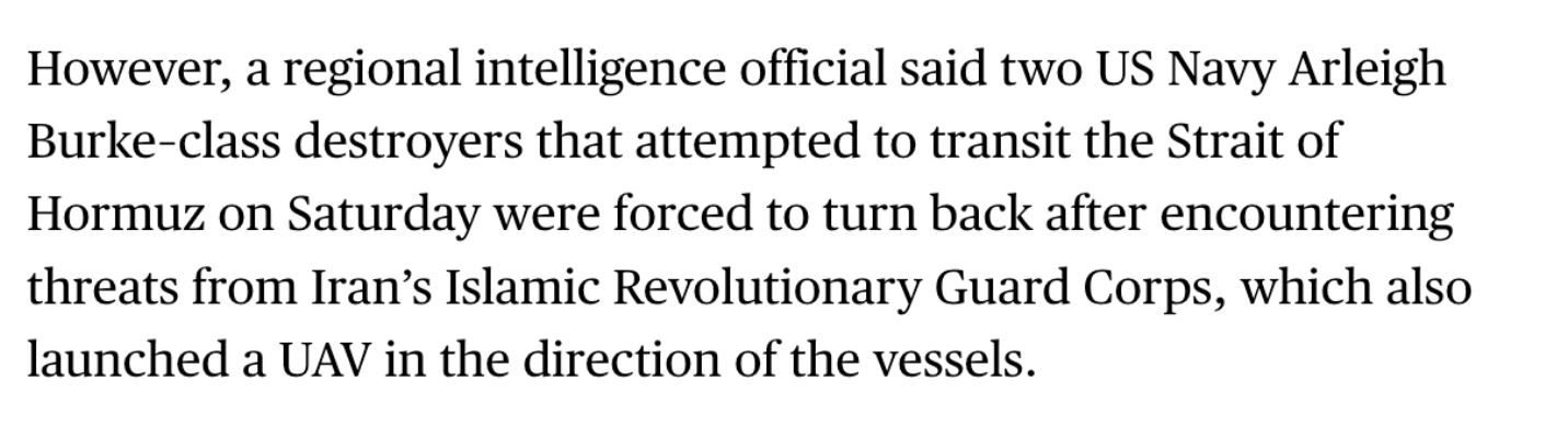 ومع ذلك، أفاد مسؤول استخباراتي إقليمي أن مدمرتين تابعتين للبحرية الأمريكية من طراز "أرلي بيرك" حاولتا عبور مضيق هرمز يوم السبت، اضطرتا للعودة بعد تعرضهما لتهديدات من الحرس الثوري الإيراني، الذي أطلق أيضاً طائرة مسيرة باتجاه السفينتين.