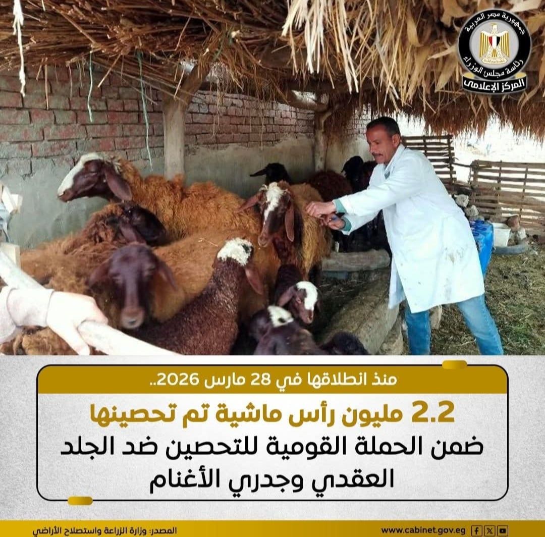 وكشف أن إجمالي ما تم تحصينه حتى الآن نحو 2.161.667 رأس ماشية على مستوى الجمهورية، شملت: 1.467.519 رأس أبقار ضد مرض الجلد العقدي، و694.148 رأس أغنام ضد جدري الأغنام.