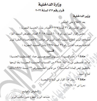 وجاء في نص القرار، أنه بعد الاطلاع على الدستور، وعلى القانون رقم 26 لسنة 1975 بشأن الجنسية المصرية، وعلى القرار الوزاري رقم 1004 لسنة 2018 الخاص بتفويض مساعد وزير الداخلية لقطاع شؤون مكتب الوزير في مباشرة الاختصاصات المقررة، تقرر حرمان المدعوة شريهان أحمد حسنين حماد، فلسطينية الجنسية، مواليد 18 أغسطس 1985، من اكتساب الجنسية المصرية.