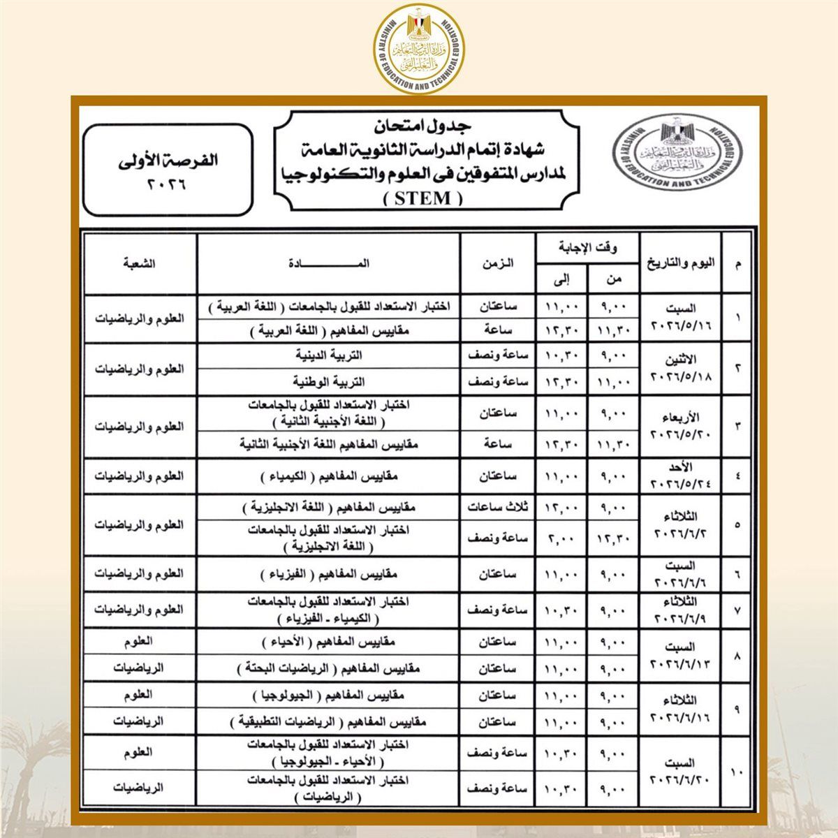 وفيما يتعلق بطلاب مدارس المتفوقين في العلوم والتكنولوجيا “STEM”، تنطلق امتحانات الفرصة الأولى يوم 16 مايو 2026 وتستمر حتى 20 يونيو 2026، بينما تبدأ امتحانات الفرصة الثانية يوم 4 يوليو 2026 وتنتهي يوم 22 يوليو 2026.