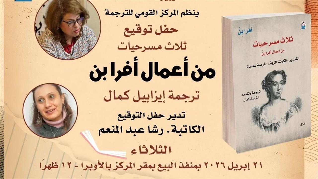 ينظم المركز القومي للترجمة برئاسة الدكتور محمد نصر الدين الجبالي، حفل توقيع كتاب "ثلاث مسرحيات" للكاتبة الإنجليزية أفرا بِنْ، وبحضور مترجمته إيزابيل كمال، وتدير النقاش حوله الكاتبة رشا عبدالمنعم، وذلك في الثانية عشرة ظهر الثلاثاء الموافق 21 أبريل الجاري، بمنفذ البيع بمقر المركز بحرم دار الأوبرا المصرية.